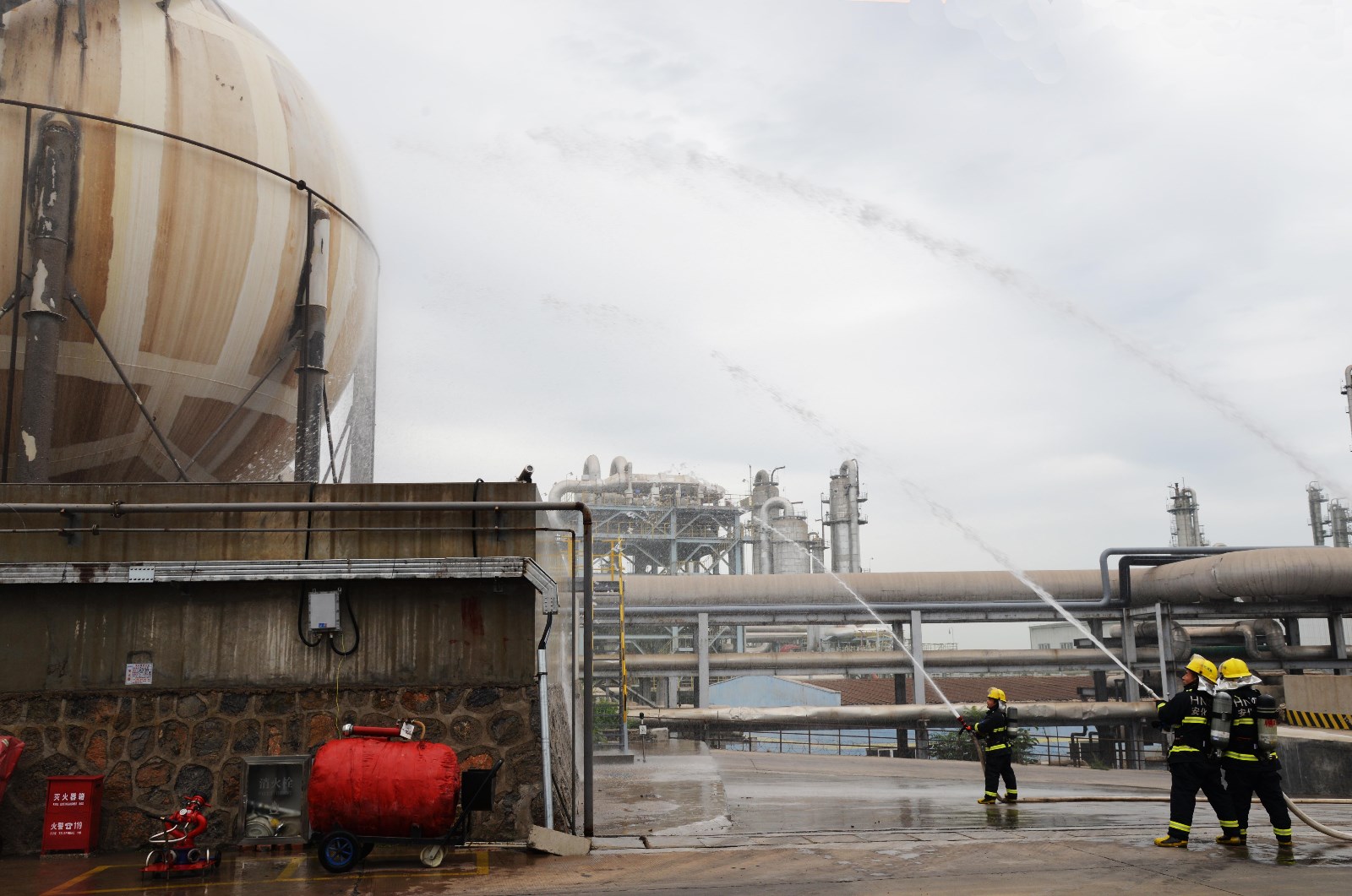 上午九點,參演單位準備就緒,總指揮徐愛軍宣布演練開始。隨即進入演練場景,三甲胺罐區泄漏,濃煙四起,現場人員出現人員中毒,公司立即啟動應急預案,開展了現場人員自救、公司消防隊支援等多層次、多科目演練。